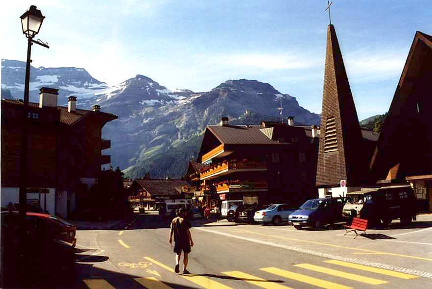 známého horského střediska - Les Diablerets. Zde se nachází i stejnojmenný ledovec. Měla tady být též feráta, o které jsme četli v novinách pod poutavým názvem "Jako pavouk na skále". Cestou jsme projížděli kolem lanovky, která vypadala na to, že by to mohla být právě ta lanovka, kterou se lze na ferátu dostat. Pro jistotu jsme ale zajeli až do města, abychom v informacích nabrali nějaké letáky a mohli se tak podívat, co je zde zajímavého. Můžete se tedy alespoň na fotografii podívat, jak to tam vypadá.