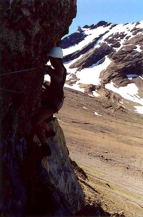Měli jsme trochu problém nalézt začátek feráty, která je dobře utajená. U východu z lanovky je šipka, která ukazuje směrem k chatě. Prošli jsme tedy okolo, značená cesta vedla dále směrem do údolí. Po chvíli se nám to už nezdálo a začali jsme se po ní ptát. Většinou tam byli ovšem samí důchodci, takže nám moc neporadili. Po chvíli se ovšem objevil evidentní sportovec, takže jsme zjistili, že musíme zpátky nahoru a pokračovat na druhou stranu. Ještě se pro jistotu zeptal, jestli máme s lezením zkušenosti, protože feráta je značně náročná. Začal i velmi sugestivně předvádět, v jakém náklonu nad propastí se tam musí chodit, což Káťu dost vylekalo.